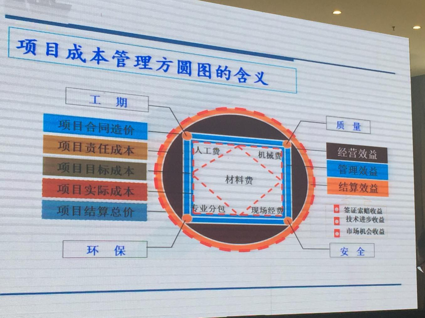 成本方圓圖中的圓形表示項目的造價,包括項目合同造價和項目結算造價。正方形表示項目的各類成本,包括項目責任成本、項目目標成本和項目實際成本。圓形的面積減去正方形的面積就是效益(圖中咖色部分)。當圖中圓形的半徑擴大時則表示項目的結算造價在合同造價基礎上提高,當正方形的邊長在科學有效的管理下縮短,則項目成本降低。當兩者的面積差(圖中咖色部分)變大時,效益則提高。所以,在項目管理過程中要不斷的尋找拓圓的方法和縮方的途徑。只有圓的有理、方的有據,那效益提高就勢在必得。